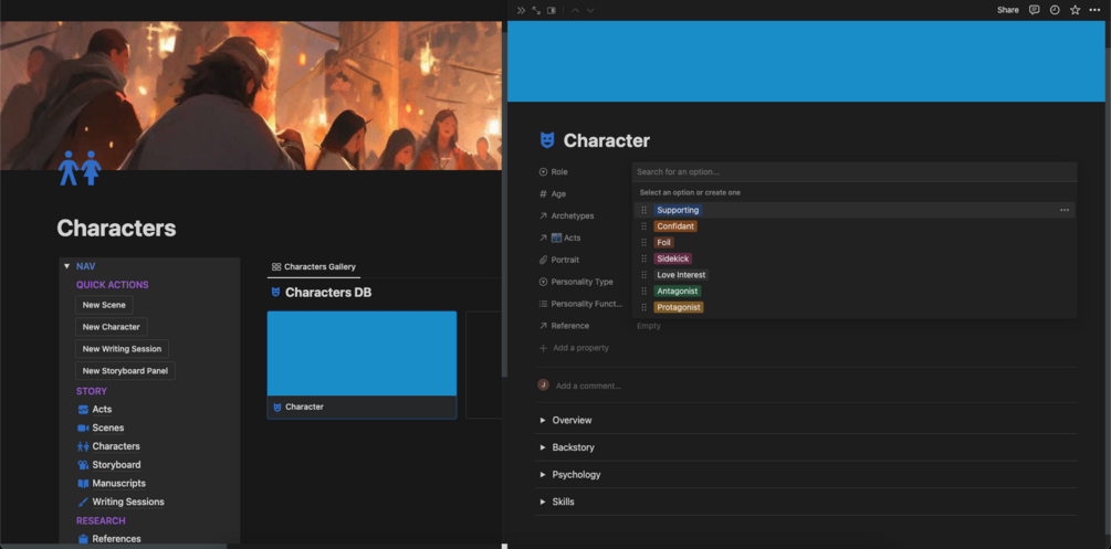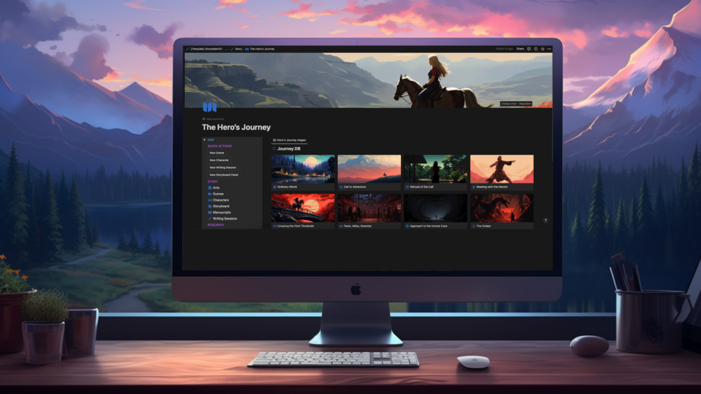 A Notion template to help with creative writing. Organize your notes and build the structure of your story.