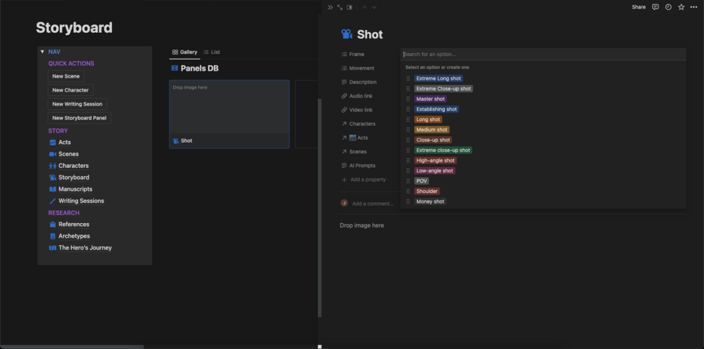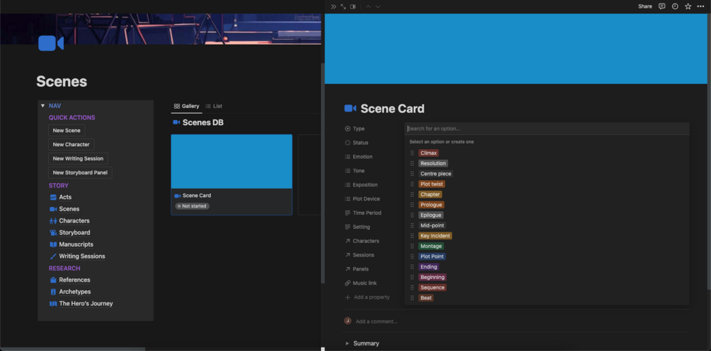 Digitally, you can create as many beats as you want and rearrange them in a similar fashion as index cards. With the built-in filtering and sorting features of Notion, you can sort the beats into different acts, and connect them to other databases like characters, storyboard and manuscripts.