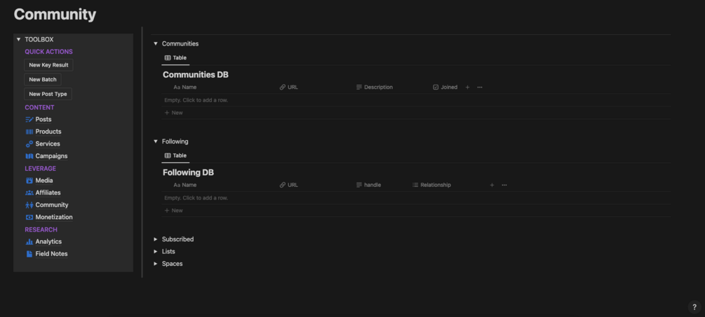 The template is broken down into 4 sections, Quick Actions, Content, Leverage and Research. By simply filling in the databases you will begin to see the connections, what works and what doesn't. This will help you change your strategy to better suit your needs.